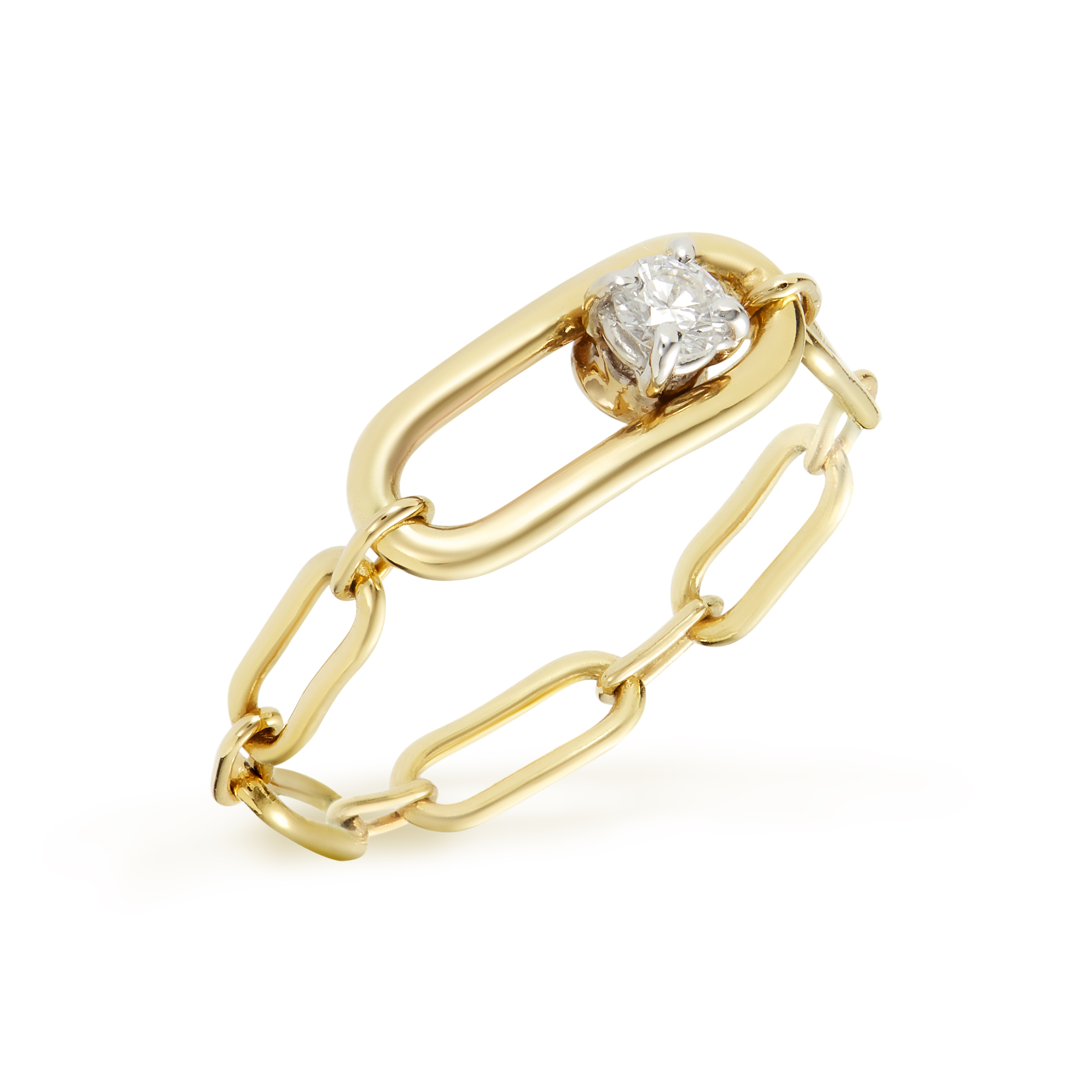 Anello in oro giallo 18 kt di catena a maglia “Paperclip” con diamante scorrevole.