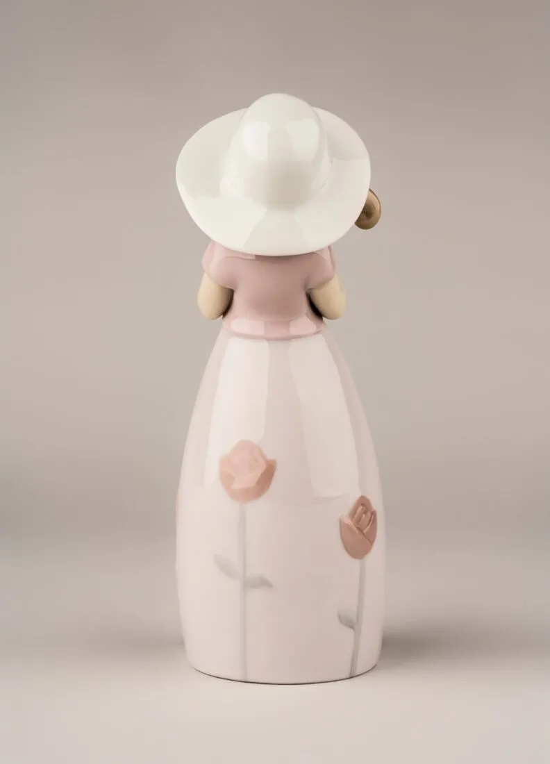 Figura porcellana scintillio con lungo abito rosa decorato con fiori di stelo lungo e un cappello bianco delicatamente in possesso di un cesto di rose controvento. Un oggetto in porcellana lucida, decorata con tenui colori pastello, ideale da regalare, collezionare o per decorare.