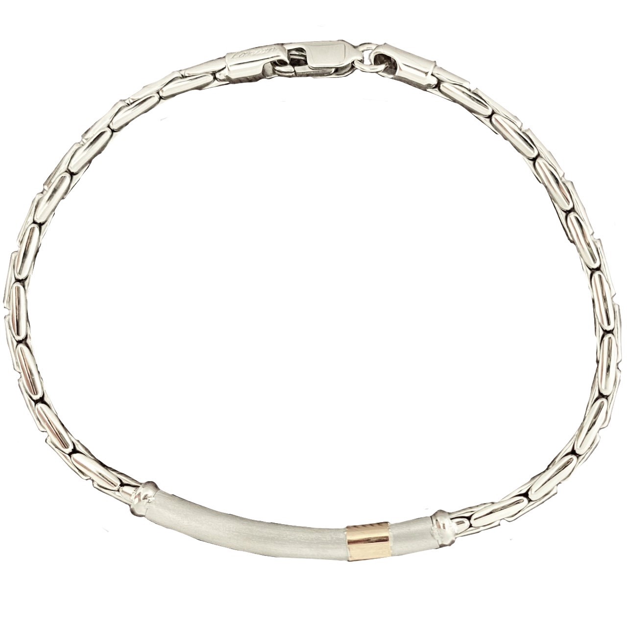 Bracciale a maglia cardano in argento 925‰ lucido, targa tubolare centrale satinata con inserto lucido in oro rosa 18 kt