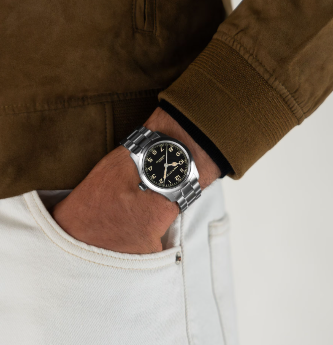 L'originale Murph, icona del mondo del cinema, viene rivisitato in chiave moderna. Su un quadrante nero si stagliano numeri leggermente bombati, per una leggibilità ottimale, e sfere a forma di cattedrale, che gli conferiscono un tocco vintage. L'originale versione da 38 mm è ora disponibile con un bracciale in metallo spazzolato a 3 maglie, che saprà soddisfare tanto gli amanti di Hamilton quanto quelli di Hollywood.