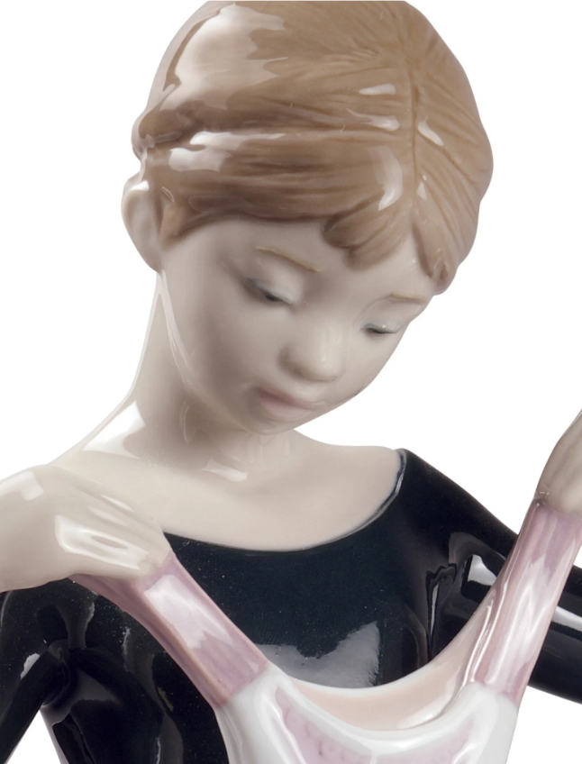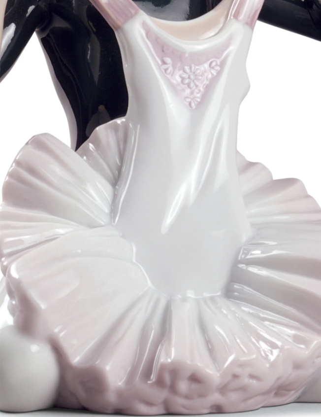 Figura ragazzina ballerina, di porcellana lucida, mentre ammira il suo vestito tutu bianco e rosa prima del debutto.